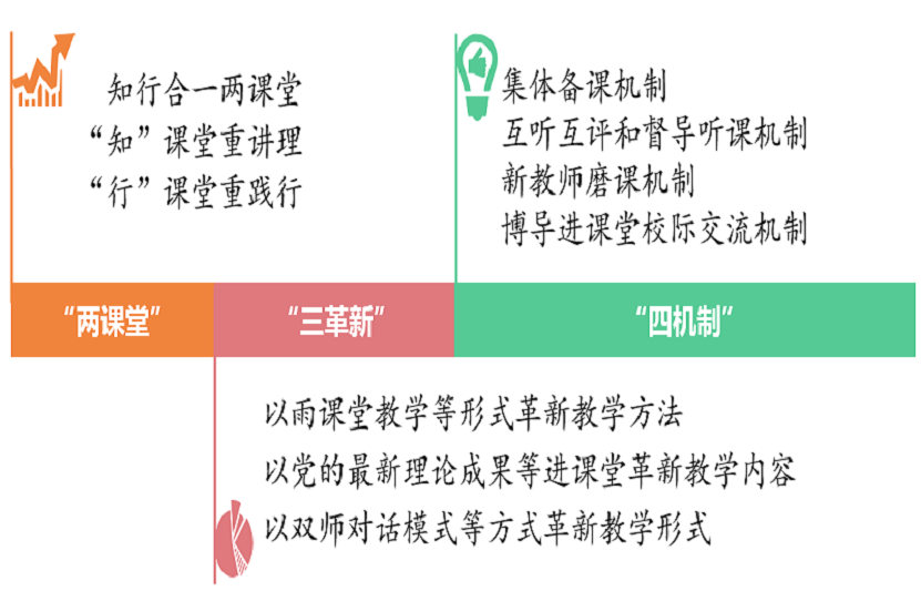 推进知行合一“两课堂”:“知”课堂重讲“理”,强化思政专业理论素养;“行”课堂重达“理”,打造“行走课堂”实践教学品牌。强化“三革新”课堂教学:以雨课堂教学等形式革新教学方法、以党的最新理论成果等进课堂革新教学内容、以“双师对话模式”等方式革新教学形式。实施“四机制”提升教学能力:集体备课机制、互听互评和督导听课机制、新教师磨课机制、“大中小学名师进课堂”校际交流机制等。