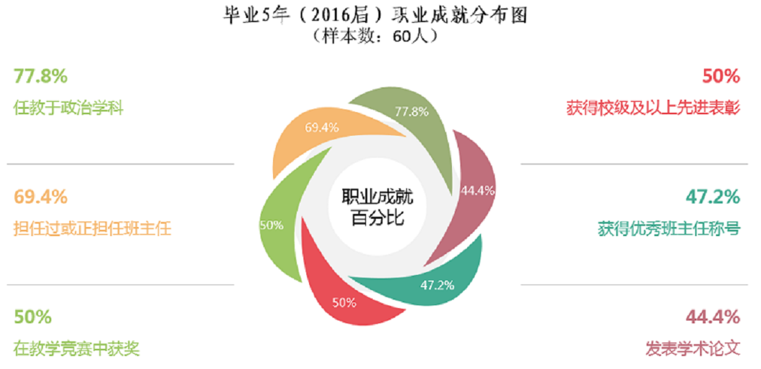聚焦基础教育,精细培养一大批情怀深、技能优的“卓越思政人才”。2016-2020届毕业生的就业率分别为100%、98.68%、100%、98.28%、98.82%,毕业生初次考研、考编率长期保持在50%以上。