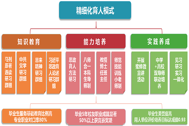 立足“思政”和“师范”两个根本取向,聚焦政治学科核心素养和思政课教师“六要”标准,对应“一践行三学会”毕业要求,确立以“政治强、情怀深”双向铸魂卓越思政人才的育人目标。“基于OBE理念的思想政治教育专业人才培养体系的构建与实践”项目,荣获校教学成果奖一等奖。