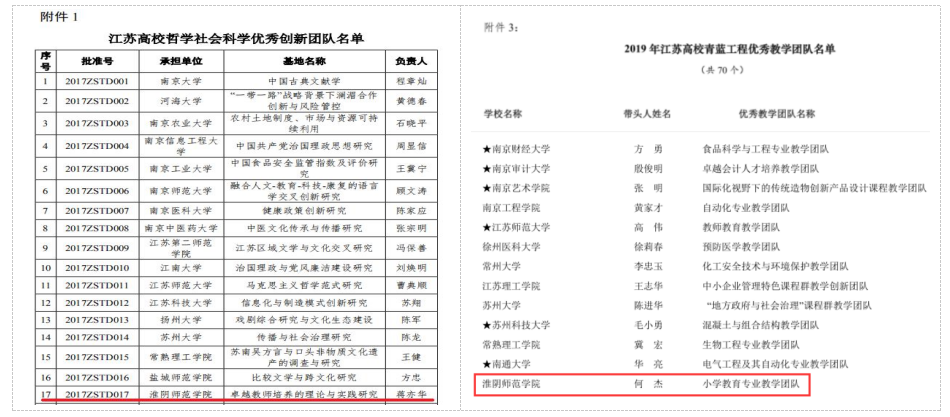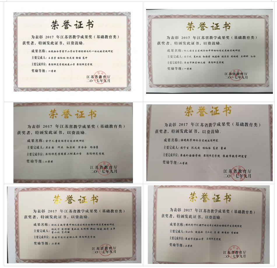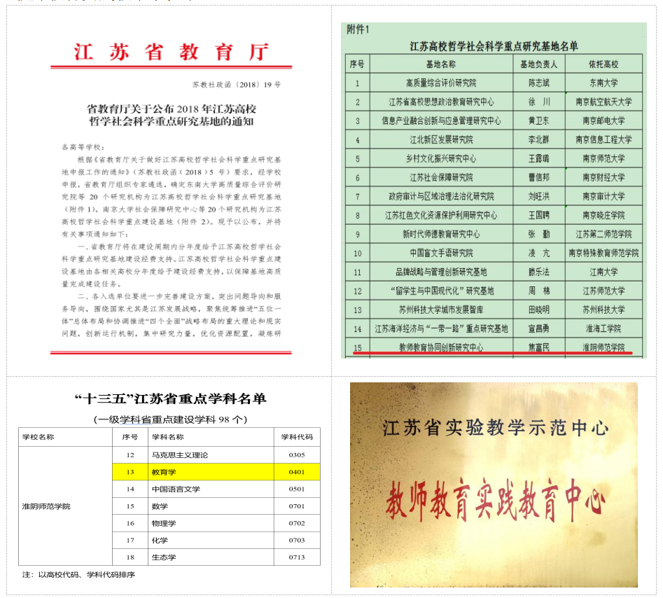 2018年,“教师教育协同创新研究中心”获批江苏高校哲学社会科学重点研究基地,2016年,“教育学”一级学科获批省重点建设学科,“教师教育实践教学中心”获批省教师教育实践教学示范中心。