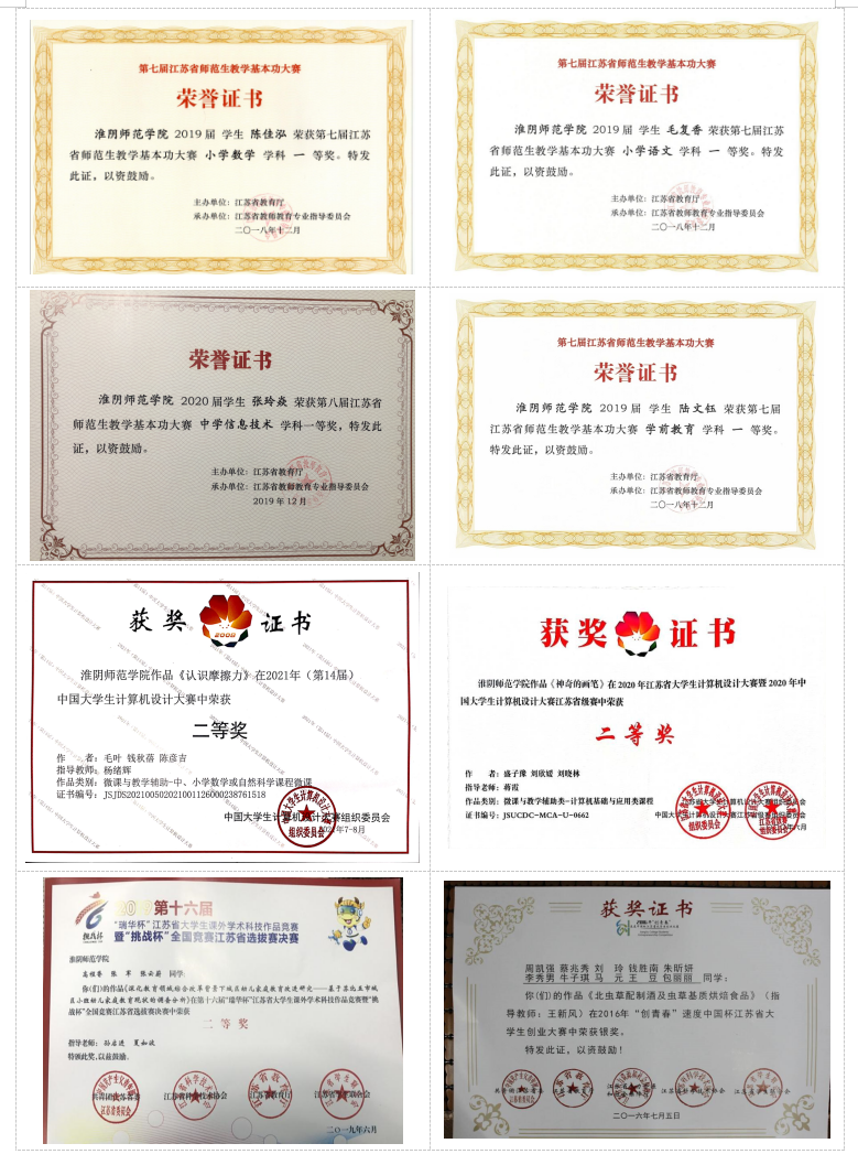 近5年来,学生在江苏省师范生教学基本功大赛、全国师范生小学语文片段教学竞赛、全国大学生计算机设计大赛、全国大学生英语竞赛、江苏省“挑战杯”等国家、省级竞赛中多次获得特等奖、一二等奖。获评省本科生优秀毕业论文3篇,获江苏省大学生创新创业省级以上项目37项(已结题)、校级项目106余项(已结题)。
