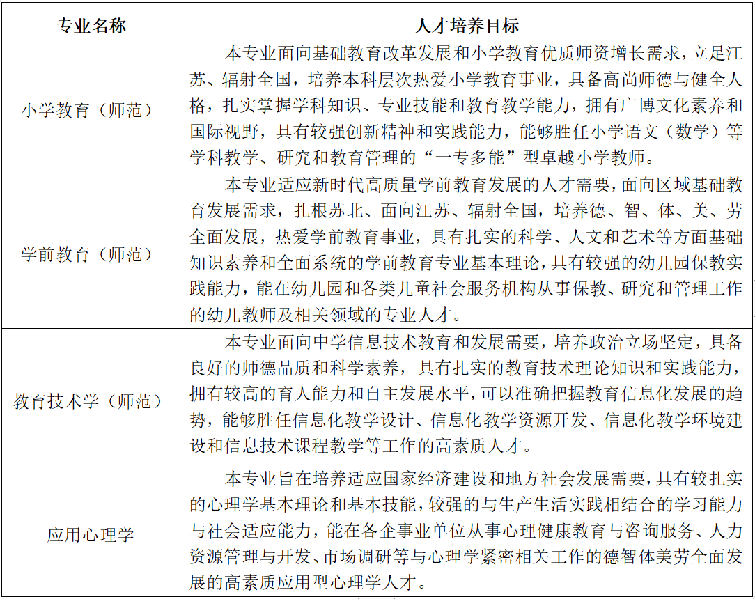 教育科学学院设小学教育(师范)、教育技术学(师范)、学前教育(师范)、应用心理学等4个普高本科专业及教育硕士(小学教育)专业学位点。目前全日制在籍普高学生2000余名。在“十三五”期间,小学教育专业2016年成为全国首个通过师范专业认证试点的专业,2019年获批国家级一流本科专业建设点,2020年获批江苏省品牌专业,并持续开展江苏省卓越小学教师培养工程项目的研究。小学教育专业是2014年教育部批准的首家中外合作办学项目,通过与美国萨姆·休斯顿大学开展国际合作,年招生40人左右。教育技术学专业获批省一流专业建设点,学前教育专业获批校一流专业建设点。