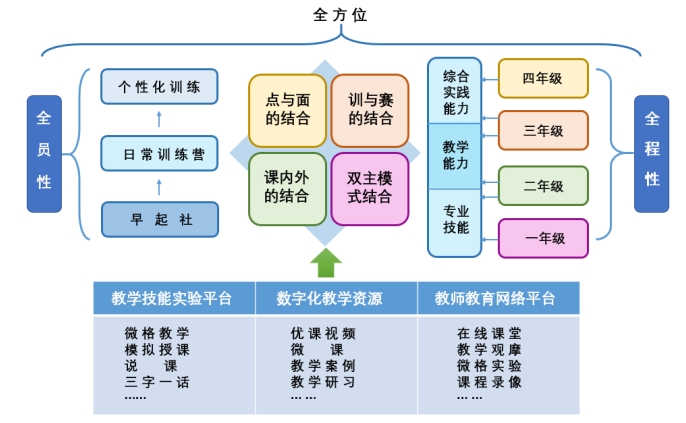 1.学院高度重视师范生教育实践培养体系建设,坚持师范生实践能力培养的日常化、全程化。根据学院的整体部署,构建了四年一贯且“见习、研习、演习和实习一体化”的实践教学体系。