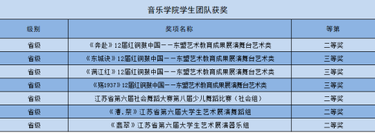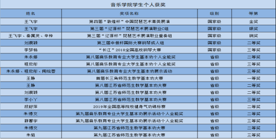 学院在课程设置上突出学生通用能力和专业能力的协同培养,注重实践训练和创新能力培养,同时,提升课程的创新性和挑战度,将知识、能力和素质有机融合,围绕专业核心能力要素,强化学生的专业基础和专业技能。近五年来,学生在国际、国家、省市级比赛中屡屡获奖。获江苏省大学生艺术展演特等奖1项、一等奖2项、二等奖1项;第三届江苏紫金合唱节铜奖1项;获首届长三角师范生基本功大赛(中学组音乐)一等奖1项;江苏省师范生教学基本功大赛一等奖1项,二等奖3项,三等奖3项;第八届江苏省高校音乐教育专业大学生基本功比赛中,获团体二等奖(第三名),个人全能一等奖1项、二等奖1项和单项奖6项;获省级大学生创新实践项目8项、校级大学生创新实践项目4项;教师指导学生公开发表论文4篇。