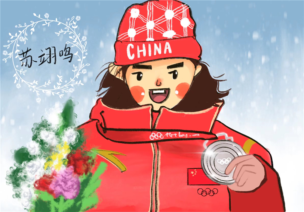 美术学院2105班宫林鸿表示:“身为青年大学生,想用自己学到的知识,用自己的方式表达对冬奥选手获得奖牌的喜悦。”