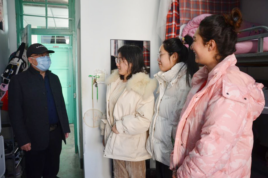 刘小华与学生们进行了亲切的交谈,详细地询问了学生在校期间的生活状态,叮嘱大家在网课期间注意寝室卫生,安全用电,同时不要松懈,要保持积极的学习状态,他鼓励同学们要相互理解,相互包容,努力营造一个安全、卫生、文明、和谐的宿舍环境,为大学生活奠定坚实基础。