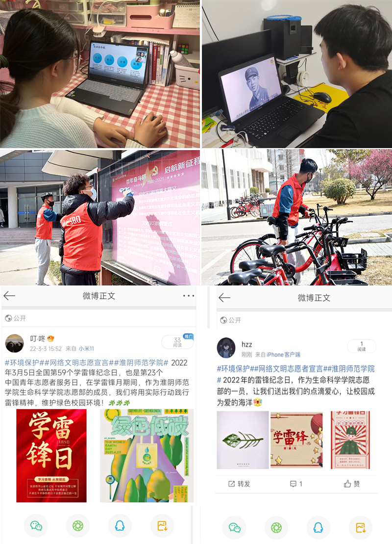 历史学院通过开展“旧衣回收,情谊暖暖”公益捐衣活动,引导学生献出一份爱心,寄托一份关怀,为春天增添一份绿色,弘扬志愿情;法政学院结合专业特色,积极引导学生对校内师生开展反诈宣传活动,通过发放学生自制反诈手册,让居民群众了解掌握各类电信诈骗的新型骗局,守护人民财产安全;计科院号召青年学生要以雷锋精神为指引,引导学生用短视频的方式抓拍好人好事,小我融入大我,彰显青年本色;经管学院、生科院通过开展网络文明志愿者宣传活动引导学生在微博等媒体平台分享学习雷锋的感悟和收获,发表心声,致敬“身边雷锋”。
