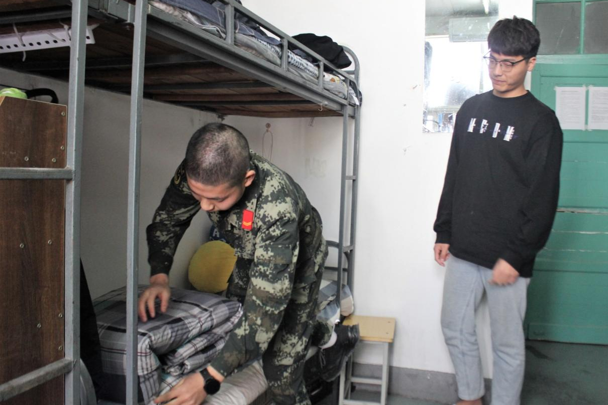 图为老兵指导学生整理内务。记者 张子怡 摄