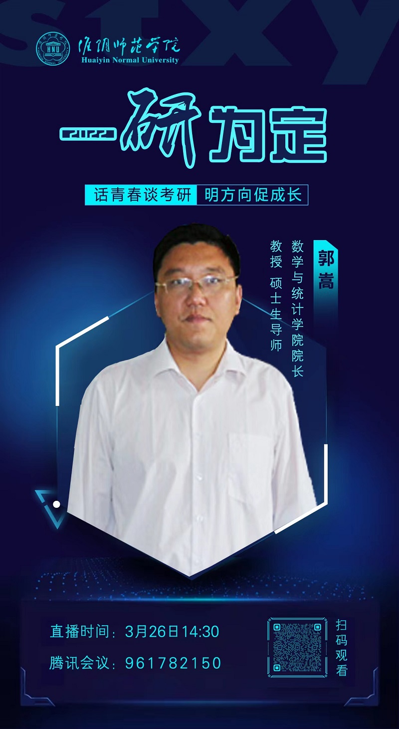 淮师新闻网3月28日电(记者 邵帅 万爽)为深入开展主题教育月活动,帮助学院2019级学生明晰考研目标、掌握择校及备考技巧,进一步提升学生考研热情,数学与统计学院于3月26日14:00在理北315召开了“一研为定——话青春谈考研 明方向促成长”辅导报告会。院长郭嵩教授主讲,2019级150余名学生通过线上、线下的方式参加了活动,活动由辅导员万爽主持。