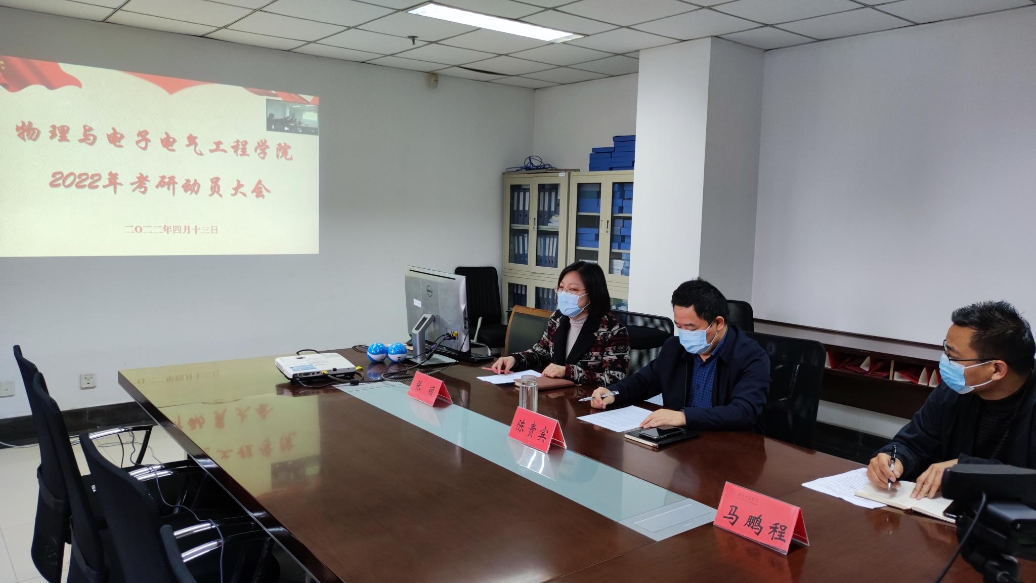 淮师新闻网4月14日电(记者 高雨阳 郭灿灿)4月13日下午,物电学院召开2022年考研动员大会,本次大会以线上线下相结合的方式召开。物电学院院长陈贵宾、副院长马鹏程、2019级所有班主任、学生参会。党委副书记张丽主持。