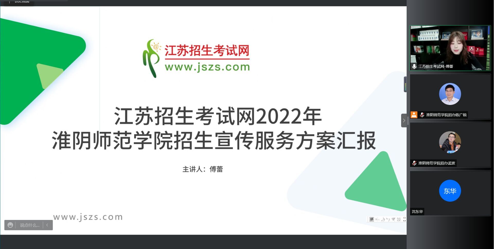 淮师新闻网4月14日电(记者 陈广锐)4月14日上午,招生与就业处举行招生宣传工作网络研讨会。招生与就业处处长沈东华及中国教育在线、江苏招生考试网、江苏招考APP等7家媒体平台代表应邀出席,会议由招生与就业处副处长孟波主持。