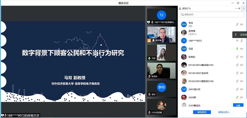 数字经济中顾客体验和行为优化成为保证数字经济可持续发展的重要议题,马双副教授在此背景下从数字经济不同形式、数字经济下顾客的行为、未来趋势三个方面,结合自己的研究内容进行了详细阐述,并就数字平台、非结构化数据等与参会师生进行了深入探讨。