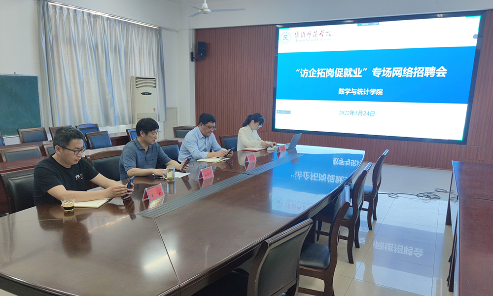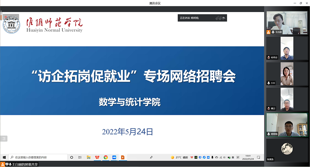淮师新闻网5月25日电(记者 王白丽 邵帅)受国内疫情影响、经济下行压力增大等因素的影响,高校毕业生就业工作面临着复杂而又严峻的形势。数学与统计学院为进一步推进2018级毕业生就业工作,搭建多方式的用人单位与毕业生双向选择的平台,努力深化校地联动、校企合作等机制。5月24日,学院在长江路校区举行“访企拓岗”网络招聘专项活动。上海沙番信息技术有限公司、太仓市瑞承文化传播有限公司、南京乐透思环保科技有限公司、淮安外国语学校、淮安市嘉洋学校等五家企事业单位应邀开展线上宣讲。院党委书记柏传志、院长郭嵩及相关专业80余名学生“云端”参加会议。会议由学工办主任王白丽主持。
