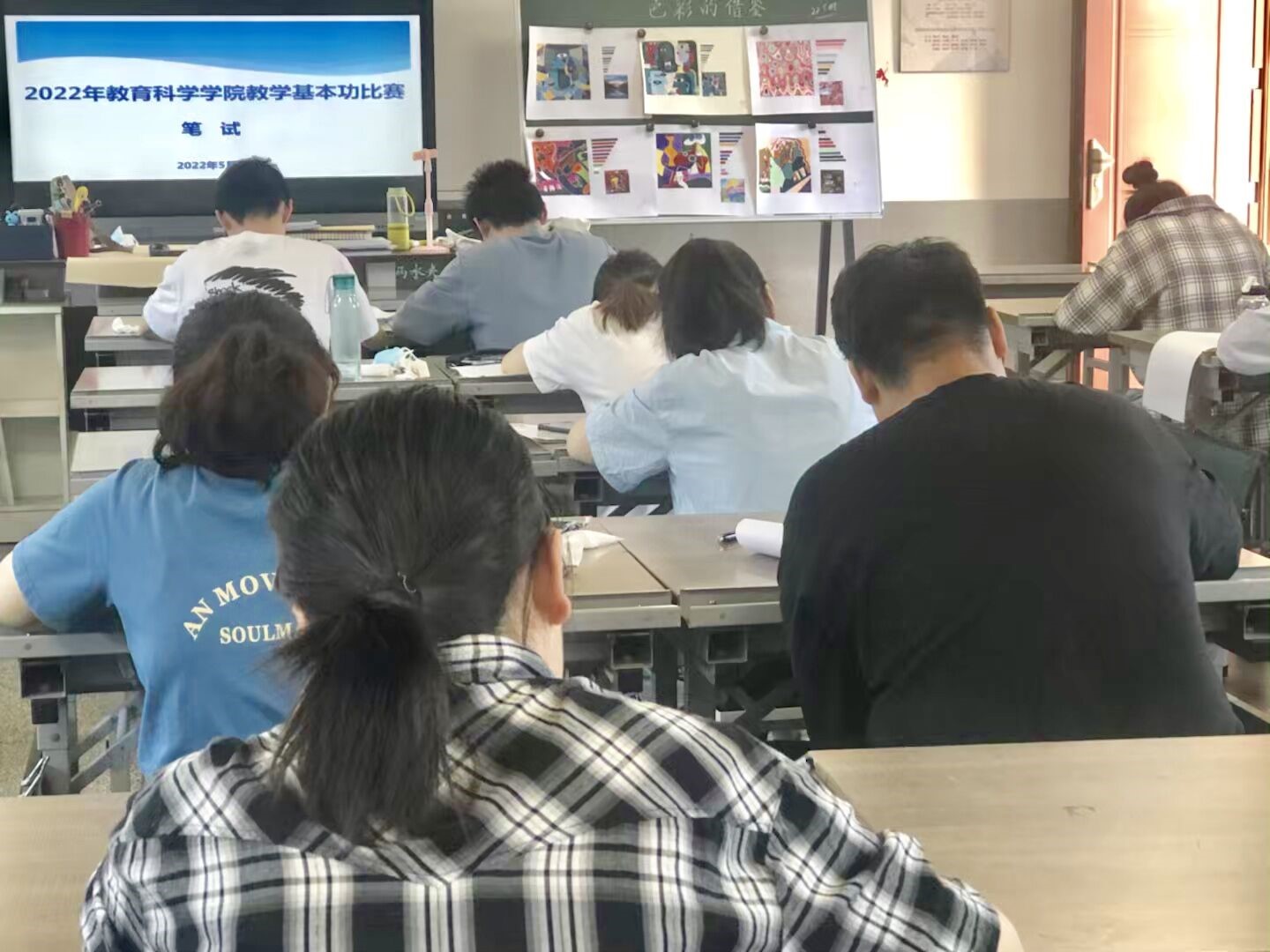 本次比赛分为两个阶段进行。第一阶段为专业笔试部分。小学教育、学前教育、教育技术三个专业共72名同学参加了5月27日下午的初赛。参赛同学在教科院1号楼教室进行了专业知识考试以及粉笔字、钢笔字考核。学前教育专业同学按照主题要求创作了儿童画,认真观看了幼儿活动视频并撰写了儿童行为观测分析表。