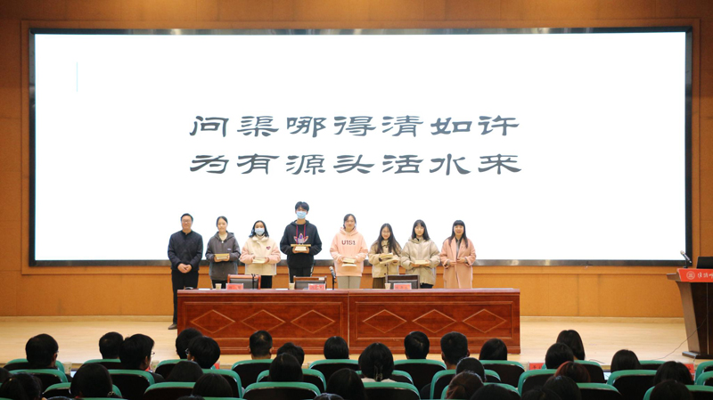 三位21级获奖学生代表向学弟学妹分享读书笔记的心得。2101班陈妙从文字素材积累、色彩区分、感悟与借鉴文字三点对读书笔记进行解读。她关注知识与知识的循环过程,指出阅读要以兴趣为切入点,进行个性化阅读。2102班丁佳钰从大学生活入手,关注如何选择书和如何读书两个方面,认为选择阅读书籍要结合老师意见,她认为要有目的性地进行选择,建议在读书时先看后摘抄。2105班的戴汶冰从如何选择书、做读书笔记的心得、关于读书与读书笔记的外延问题等三个方面分享经验,得出“大学生唯有在不断学习和阅读下,心灵方得到沉淀”这一结论。她希望同学们可以始终践行“博学之,审问之,慎思之,明辨之,笃行之。”