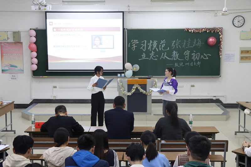 2004班开展了《学习模范张桂梅,立志从教守初心》主题班会观摩。活动起初,主持人以“赤诚之心,奉献之心,仁爱之心”“坚定信仰者、忠实实践者”等关键词导入团日活动的主题,“二十开启教育路,育人育己传师德;痛失丈夫不失志,丽江华坪有讲台;病魔缠身令人恶,切瘤重返报大恩;含辛追资苦建校,女子中学旗飘扬;上山下乡劝读书,党旗面前终报党。”全体同学通过全国2020年度人物颁奖视频重温了张桂梅老师一生奉献教育事业的感人故事。李雨桐、刘沁怡同学以情景剧方式展开了一场跨越时空与空间的对话,彰显育人初心的价值所在。在抽签选答环节,同学们分别对“在生活学习中如何以张桂梅老师为榜样”“分享一下自己身边有关师德的事例”“最赞美、最崇拜张桂梅老师哪个品质”三个问题分享了自己的感悟和见解,“敬业”“奉献”“精神支持”等话语间充满同学们对教育事业的崇高敬意,最后,同学们通过现场书信的方式给“未来的自己”寄出了一封信。苗军为同学们作了“争做新时代‘四有好老师’”的主题分享,解读了“四有好老师”的时代内涵,鼓励同学们将来在教师岗位上以生命影响生命,做传道、授业、解惑的忠实实践者和示范者,与学生共同成就。